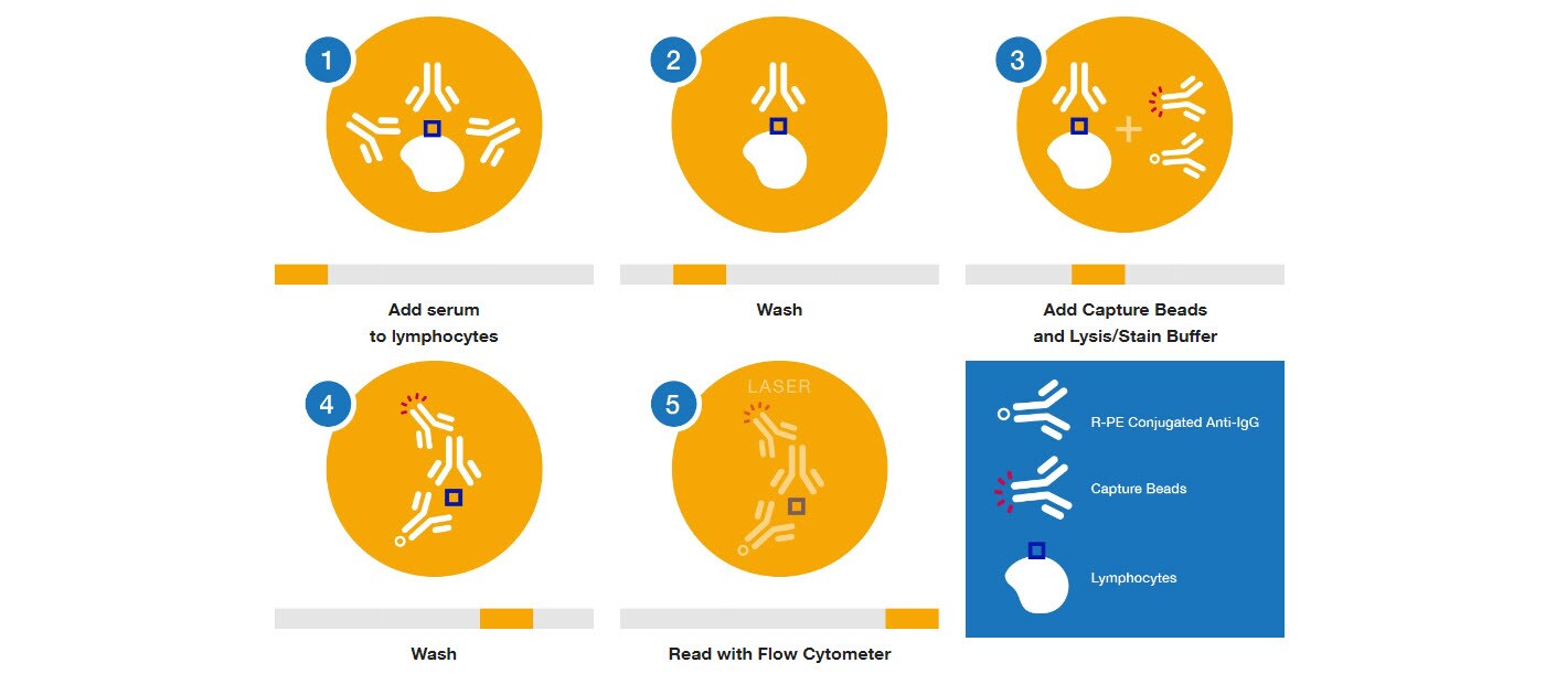 Il test One Lambda™ FlowDSA-XM è un test di compatibilità basato sulla citometria a flusso, ottimizzato per la rilevazione di anticorpi leucocitari. Combinando il tradizionale test di compatibilità cellulare tramite citometria a flusso con la specificità della tecnologia delle microsfere, il test FlowDSA-XM distingue selettivamente gli anticorpi leucocitari dagli autoanticorpi. Dopo l’incubazione dei linfociti con siero umano, qualsiasi IgG legata sulla superficie cellulare viene marcata con anti-IgG umana marcata con R-PE. Le microsfere di cattura FlowDSA-XM si legano selettivamente al complesso anticorpo/antigene/anti-IgG umana risultante e l’intensità della fluorescenza viene misurata per indicare la quantità relativa di anticorpi leucocitari presenti nel siero.